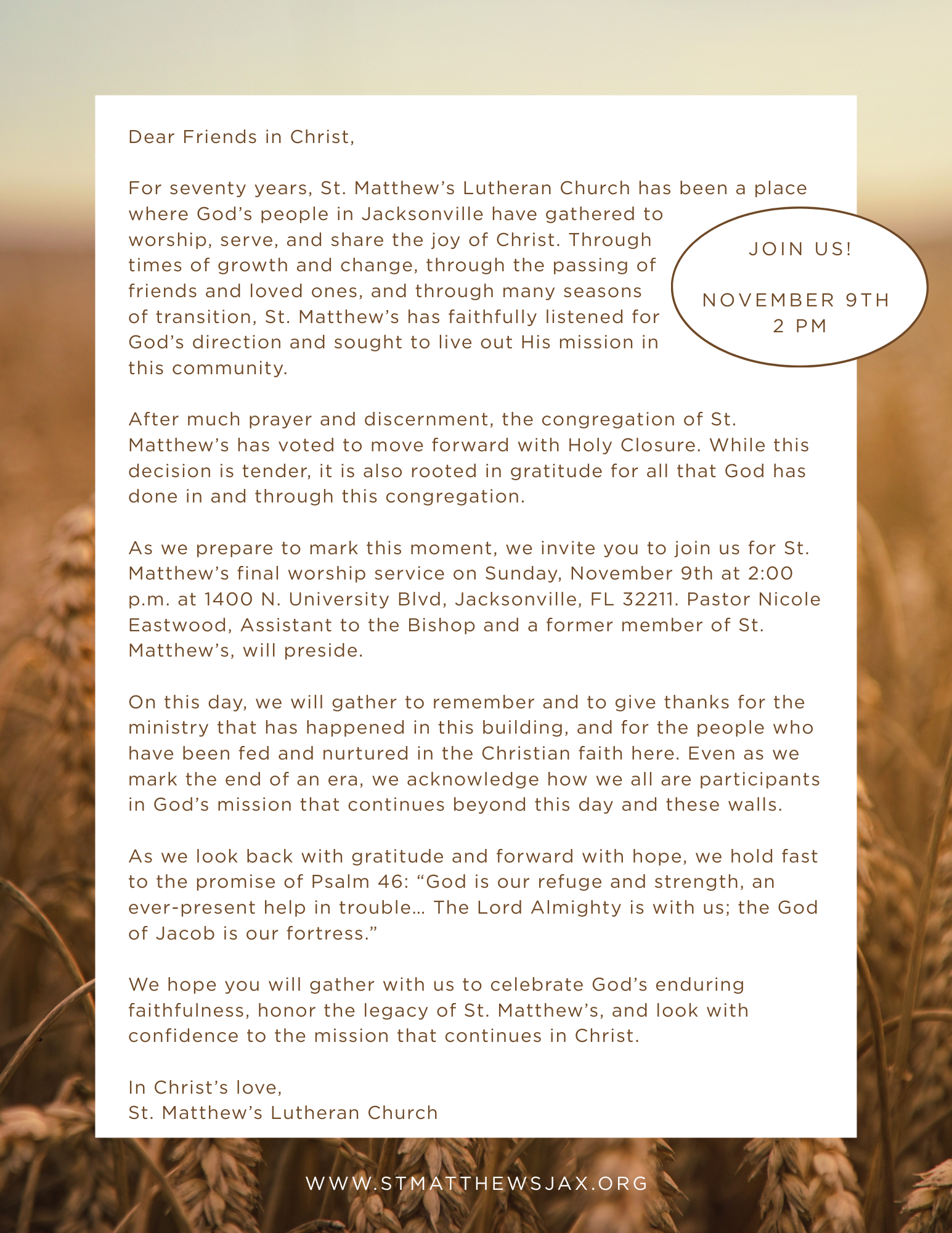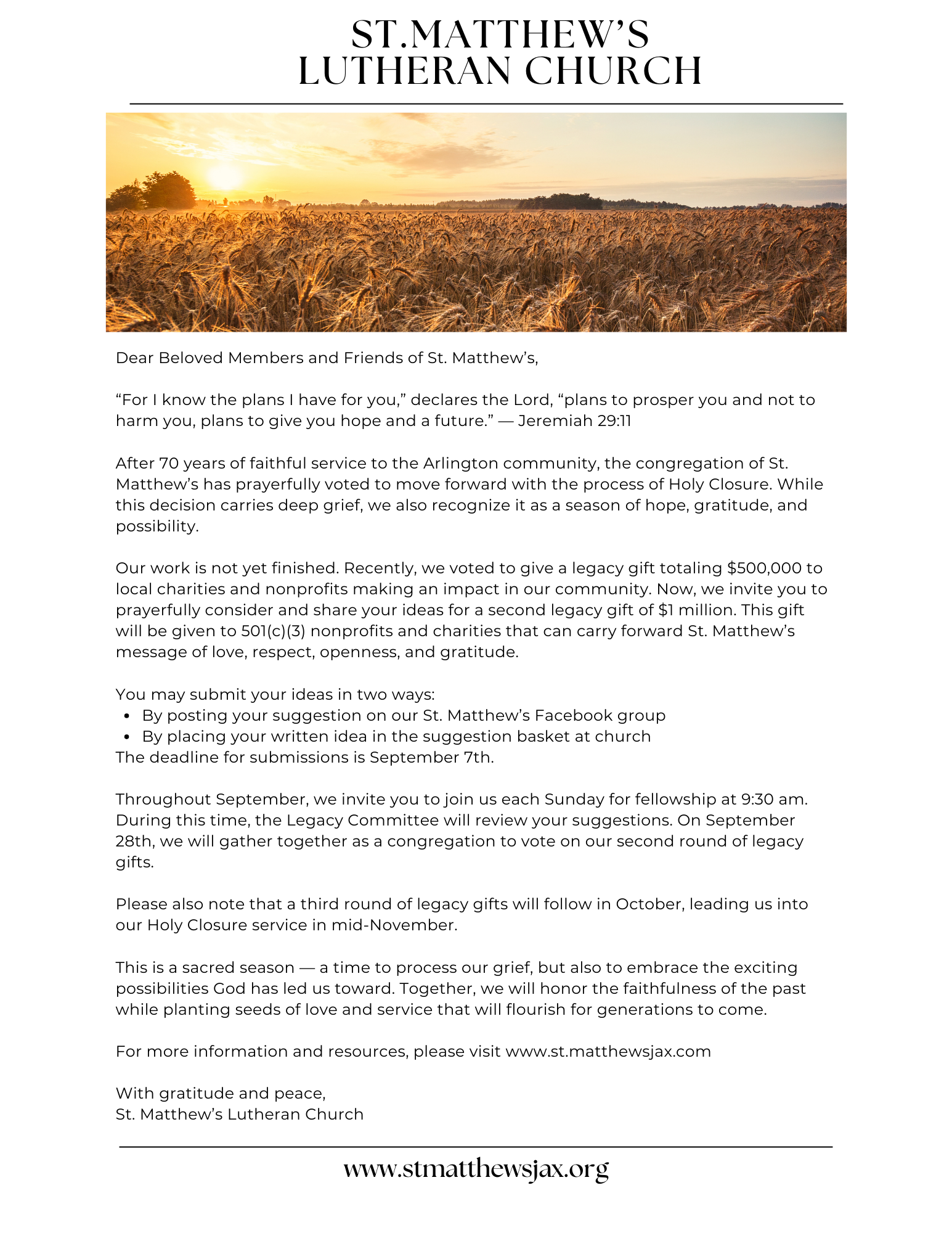 Even as we grieve, we prepare with gratitude for the legacy of St. Matthew’s. Your faithful stewardship ensures that ministry continues far beyond our walls.